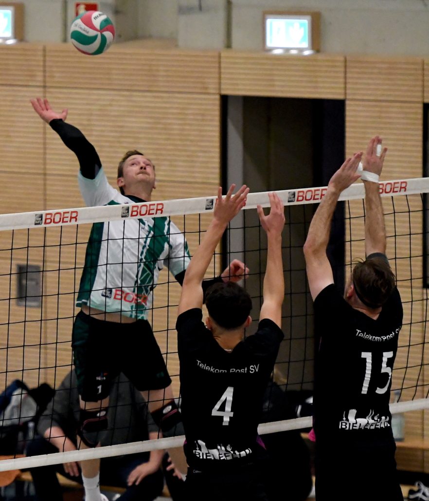 Erneut den ersten Sieg verpasst: Trotz einer Steigerung reichte es für Philipp Heuermann (links) und die SG-Volleyballer gegen Telekom Post SV Bielefeld II nicht zum Erfolg.