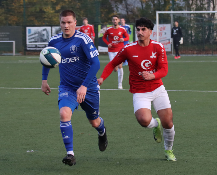 „Hauptsache gewonnen“, atmete er nach dem 4:3-Auswärtssieg seiner SG Coesfeld 06 II auf. Und der war verdient, musste auch Dennis Krampe zugeben: „Weil wir vor allem in der ersten Halbzeit die Diagonalbälle nicht gut verteidigt haben und immer wieder in Gefahr geraten sind.“ Nach der frühen Führung der SG durch Mohamad Diab (3. Minute, Foto rechts) nutzte Nick Richter eine Ecke, die aus SG-Sicht keine war, zum 1:1-Ausgleich (9.). In der 25. Minute war die Partie sogar gedreht, als Nick Richter den Ball nach einem Pfostentreffer noch einmal vor das Tor brachte und Louis Kerkhoff zum 2:1 traf. „Wir haben aber super reagiert und sind immer wieder gefährlich zur Grundlinie gekommen“, lobte Morten Herbstmann sein Team.