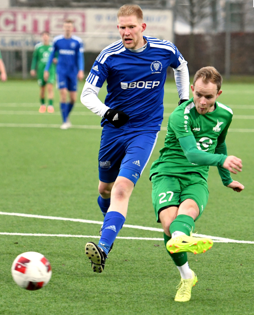 Fast wäre der Außenseiter mit einer Führung in die Pause gegangen. Denn nach einer Hereingabe in den Strafraum hielt Justin Plesker seinen Fuß hin und markierte nach einer halben Stunde das 1:0 für das Schlusslicht der A-Liga. Beinahe wäre sogar nur drei Minuten später das 0:2 gefallen, doch Louis Kerkhoff zielte nach einem Konter und Querpass von Nick Richter freistehend neben den Kasten. „Lette hat es sehr ordentlich gemacht“, zollte Frank Averesch den Gästen seinen Respekt. Allerdings lag das auch daran, dass sich seine SG’ler mal wieder mit der Chancenver-wertung sehr schwer taten. „Vier Hundertprozentige hatten wir vor der Pause“ schüttelte der Trainer den Kopf. „Mindestens zwei davon müssen wir machen.“ Aber Lucas Jacobs (7.) scheiterte nach Pass von Marcel Deelen ebenso an Torwart Jonas Droste wie Jonas Warmes nach feinem Diagonalball von Simon Rotthäuser (38.). Jonas Warmes zog in den Strafraum und traf aus spitzem Winkel den Pfosten, den Abstauber von Lucas Jacobs blockte Michael Sandscheiper vor der Linie (21.). Und Mika Rotthäuser schoss nach Steilpass von Jonas Warmes frei vorbei (42.) „Deshalb war der Ausgleich vor der Pause extrem wichtig“, atmete Averesch durch. Nach dem Foul und Platzverweis versenkte Simon Rotthäuser den Strafstoß, auch wenn Jonas Droste noch mit den Fingerspitzen am Ball war (44.).