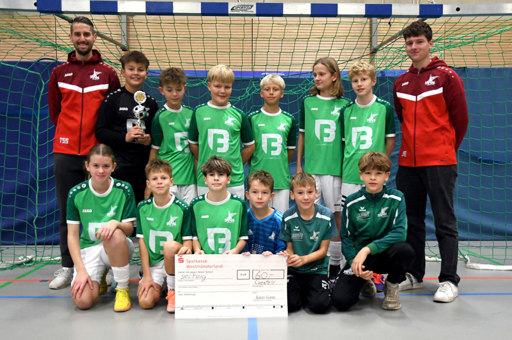 Ein Unentschieden hätte gereicht im abschließenden Spiel gegen die DJK Coesfeld. Doch damit wollten sich die D I-Junioren nicht zufrieden geben: Die Mannschaft von Thomas Schulze Spüntrup (links) und Justus Eggemann (rechts) setzte sich klar mit 3:0 durch und sicherte sich mit einer makellosen Bilanz den Hallenfußball-Stadtpokal der Sparkasse Westmünsterland. Drei Siege aus drei Begegnungen, so lautete die Bilanz des neuen Titelträgers bei den D-Jugendlichen.