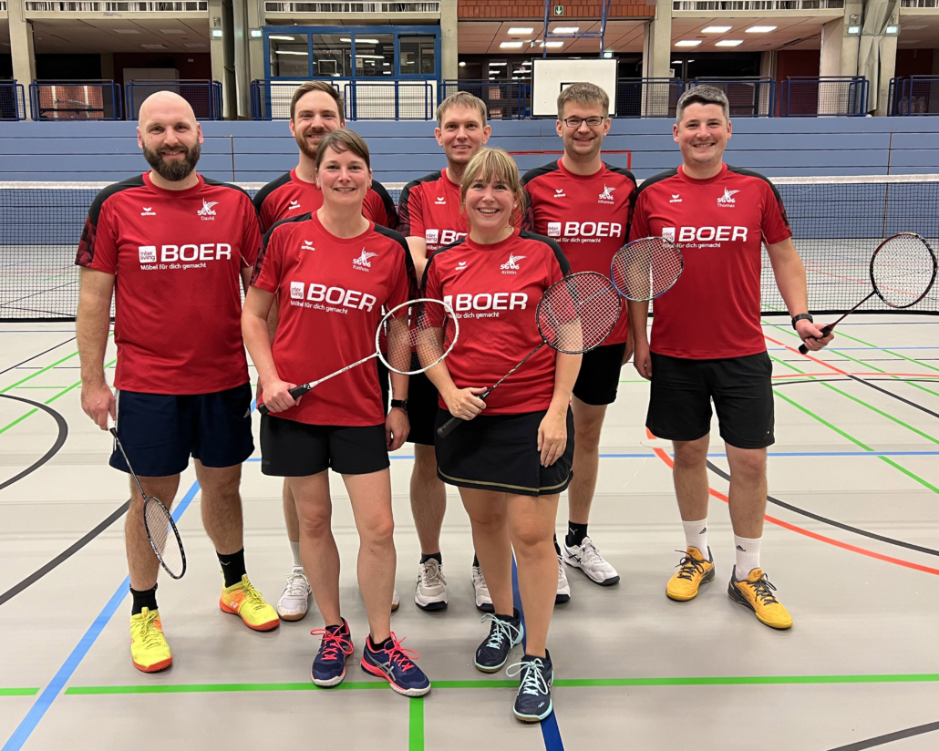 Die 1. Mannschaft der SG Coesfeld Badmintonabteilung blickt auf ein erfolgreiches Sportjahr 2025 zurück. Im April gelang der makellose Aufstieg von der Kreisliga in die Bezirksklasse ohne Punktverlust. Eine starke Teamleistung, die auf einer gemeinsamen Mannschaftsfahrt im Sommer gebührend gefeiert wurde. Auch in der neuen Saison geht die Mannschaft wieder motiviert zur Sache und die Zwischenbilanz zur Saisonmitte ist durchaus positiv. Mit einem klaren 6-2 Heimsieg gegen Gronau gab es direkt einen erfolgreichen Saisonauftakt. Im zweiten Spiel gegen Schöppingen und auch in der dritten Begegnung gegen Legden gab es jedoch knappe 5-3-Niederlagen für das Team von Mannschaftsführer Thomas Besseling. „Uns war allen klar, dass wir in der höheren Spielklasse nicht wieder so einen Durchmarsch erleben werden. Das Spielniveau der Gegner hat zugelegt“, fasst Besseling zusammen. Die Rückkehr in die Erfolgsspur gelang mit einem umkämpften 5-3-Auswärtssieg gegen No Limit Nottuln. An den beiden letzten Spieltagen gegen Emsdetten und Vreden zeigte sich, wie eng die Konkurrenz diese Saison zusammenliegt. In beiden Partien gab es beim Endstand von 4-4 keinen Sieger. Nach Abschluss der Hinrunde liegt die SG-Auswahl auf dem zweiten Tabellenplatz. „Wir sind sehr zufrieden, dass wir als Aufsteiger auf dem zweiten Platz überwintern,“ ordnet Besseling den Tabellenplatz ein. In der spielfreien Zeit wird sich das Team mit dem erfahrenen Spielertrainer Jens Brosterhues weiter auf die Rückrunde vorbereiten. Am 24. Januar trifft das Team dann erneut auf den TV Vreden.