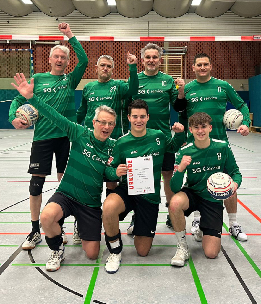 Frank Dröger, Dirk Osthoff, Thomas Langer und Ralf Liebschner (h.v.l.) vollendeten zusammen mit Carsten Schmitt, Philipp Eller sowie Clemens Frie (v.v.l.) ihr Meisterstück. Im Vorfeld hatten sie sich ein enges Titel-Duell geliefert. Letztlich entschied ein Satzgewinn gegen die Dritte des TSV Hagen das Rennen.