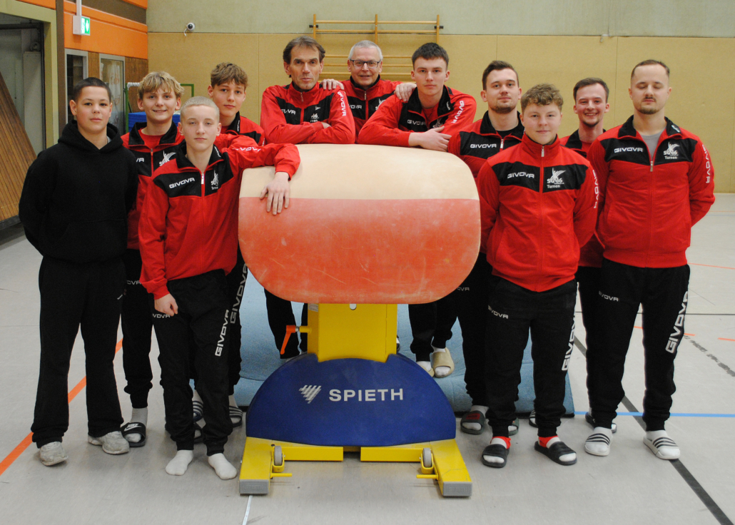 Im ersten Turnwettkampf des Jahres ging die SG Coesfeld 06 bei TuS Stockum leer aus: Mit von der Partie waren (v.l.) Michael Linke, David Friess, Lian Kühn, Vincent Werenbeck-Ueding, Joachim Hillers, Trainer Ulrich Rickert, Martin Gunt, Alexander Sueck, Mattis Lütke Brochtrup, Simon Sandscheiper und Tim Jakob; es fehlen Koray König, David Kondring, Kudret Aydin und Heimkampfrichter Luca Waltering.