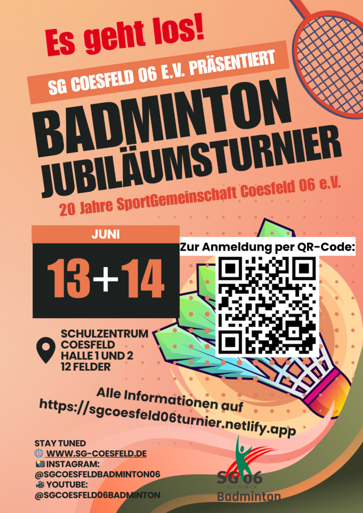 20 Jahre SportGemeinschaft Coesfeld 06 e.V. – das feiern wir mit einem ganz besonderen Turnierwochenende! Am 13. und 14. Juni 2026 laden wir alle herzlich zu unserem großen Badminton-Jubiläumsturnier ins Schulzentrum Coesfeld (Halle I und II) ein. Auf insgesamt 12 Feldern erwartet euch ein sportliches Highlight, das unserem 20-jährigen Vereinsbestehen einen würdigen Rahmen verleiht.