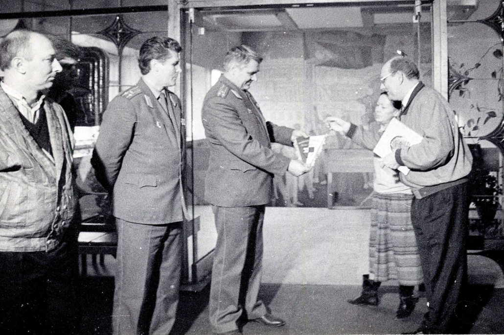 Ein Raspo-Wimpel für ZSKA Moskau: Bernhard „Boschi“ Stippel (rechts) überreichte die Erinnerung im April 1991 vor Ort an die Funktionäre des großen russischen Sportvereins.