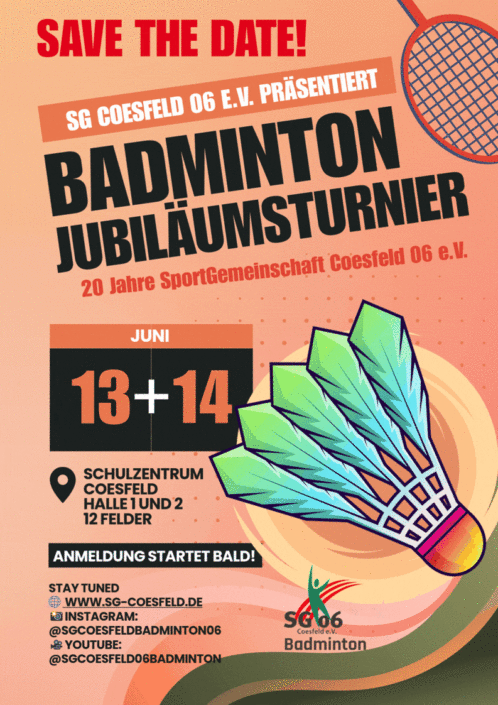 Möchtest Du körperlich fit bleiben und dabei auch noch Spaß haben? Bist Du auf der Suche nach einer neuen Herausforderung im Sport? Dann bist Du beim Badminton, dem schnellsten Rückschlagspiel der Welt, genau richtig! Komm in die Gemeinschaft des SG Coesfeld 06 e.V. Badminton!