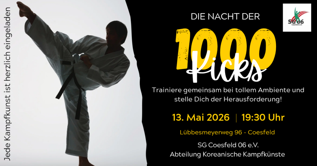 Das Training beginnt bei uns mit den „Bambinis“ von 4- 6 Jahren und endet ohne Altersbeschränkung in der Gruppe „Taekwondo ab 30“. Unsere Trainer und Schwarzgurte sind in der offiziellen „Kukkiwon“ in Korea zertifiziert und registriert. Wir nehmen regelmäßig an Turnieren & Lehrgängen teil und gehören seit über 27 Jahren zu den erfolgreichsten Vereinen (ehem. BTF e.V.) im Norden NRW. Aus unseren Reihen sind bis heute viele Schwarzgurte, Trainer und erfolgreiche Turnierwettkämpfer entstanden. Für uns bedeutet Kampfkunst = Gemeinschaft und so heißen wir alle am Lübbesmeyerweg 96 in Coesfeld willkommen.